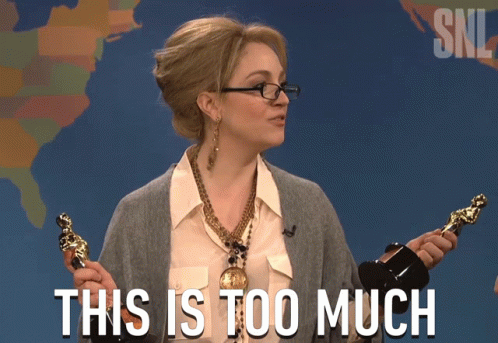 Meryl Streep, on SNL, humorously holds two Oscar trophies, exclaiming 'This Is Too Much'.