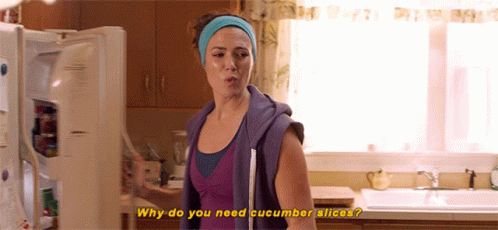 Rebecca Pearson (Mandy Moore) questions the need for cucumber slices in a kitchen scene from This Is Us.