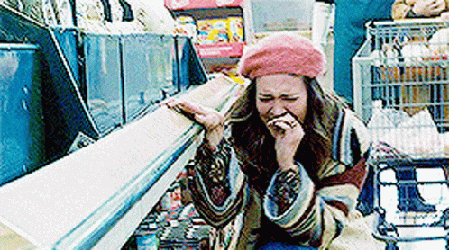 Rebecca Pearson (Mandy Moore) crying in distress while leaning on a shelf in a store.