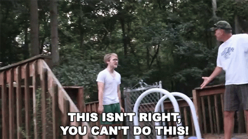 A young man confronts an older man by a pool, exclaiming "THIS ISN'T RIGHT, YOU CAN'T DO THIS!".