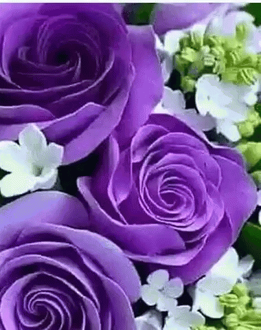 Close-up of vibrant purple roses and delicate white flowers in full bloom.