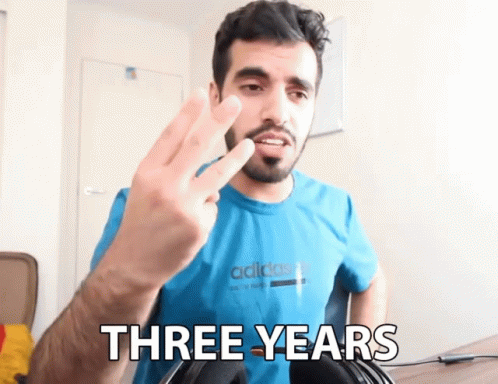 Abo Reja, wearing an Adidas shirt, gestures with his hand while saying 'Three Years'.