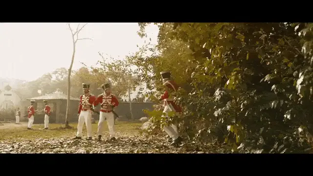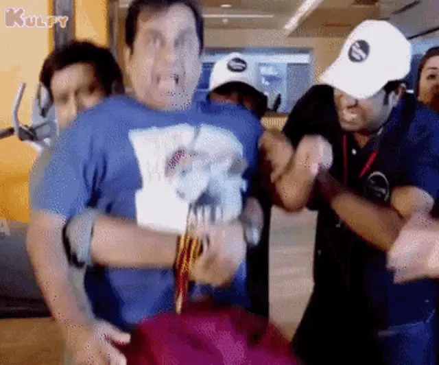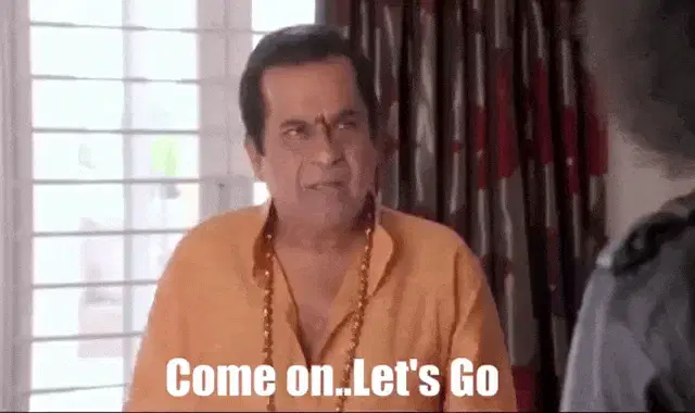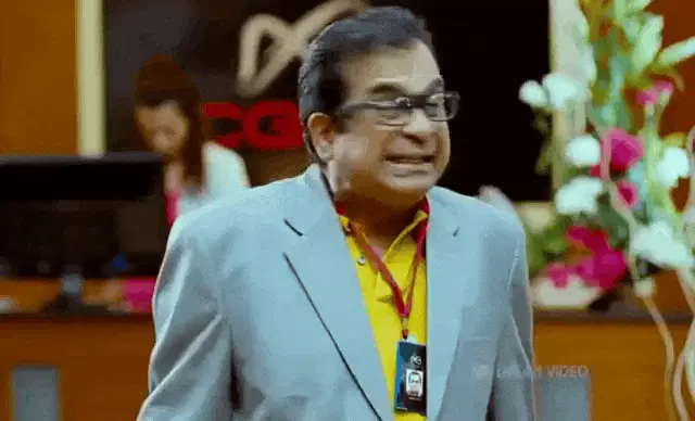 Chiranjeevi in a blue shirt and sunglasses, animatedly talking to an older woman in a comedic scene.