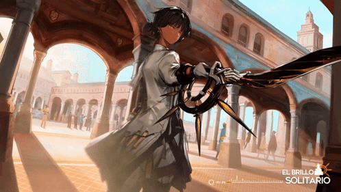 Thorns from Arknights stands in a sunlit courtyard, wielding his unique sword-like weapon, with 'El Brillo Solitario' text.