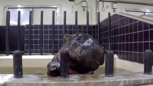 A cute baby hippopotamus in an enclosure opens its mouth wide, revealing its teeth.