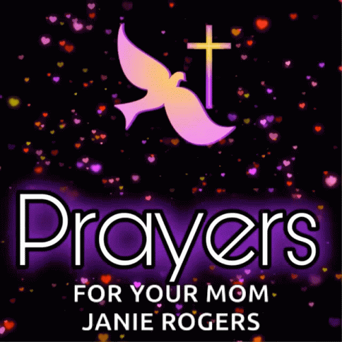 A heartfelt graphic offering 'Prayers for Your Mom Janie Rogers,' featuring a dove, cross, and sparkling hearts.