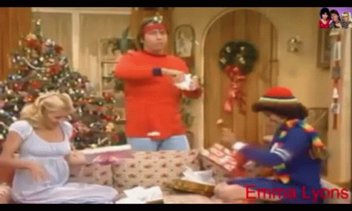 Emma Lyons and cast celebrate Christmas on Threes Company, opening gifts in a festive living room.