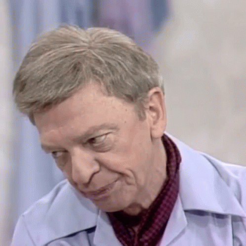 Don Knotts as Ralph Furley from Three's Company, looking to the side with a smirk, wearing a blue shirt and scarf.