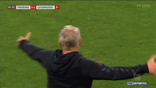 Christian Streich, Freiburg coach, reacts with frustration during a Bundesliga match against Leverkusen, making a 'throw away' gesture.