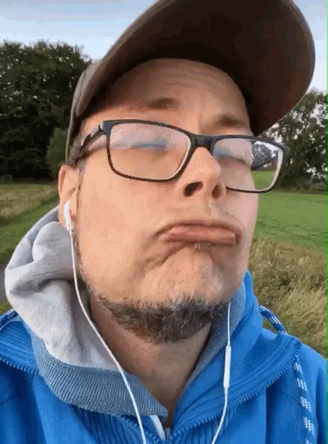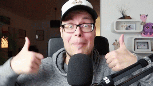 Man with glasses and a cap gives two enthusiastic thumbs up in front of a RØDE microphone, expressing extreme happiness.