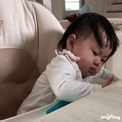 An adorable baby sitting in a high chair gives a clear thumbs-up gesture.