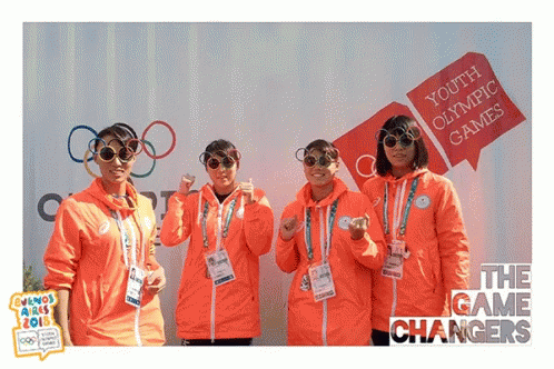 Four Youth Olympic Games Game Changers in orange jackets give thumbs up, wearing fun Olympic ring sunglasses.
