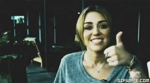 Miley Cyrus smiles brightly and gives a confident thumbs up to the camera.