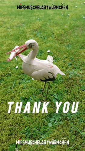 Decorative stork figurine on grass with 'THANK YOU' text, conveying a message of gratitude.