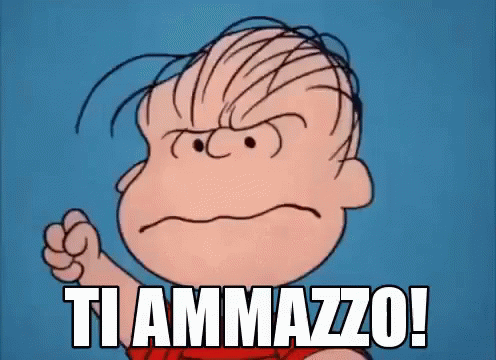 Linus from Peanuts cartoon, looking very angry with fists raised, exclaiming 'I'll kill you!'
