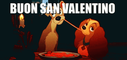 Lady and the Tramp share an iconic spaghetti kiss for Valentine's Day, with 'Buon San Valentino' on screen.