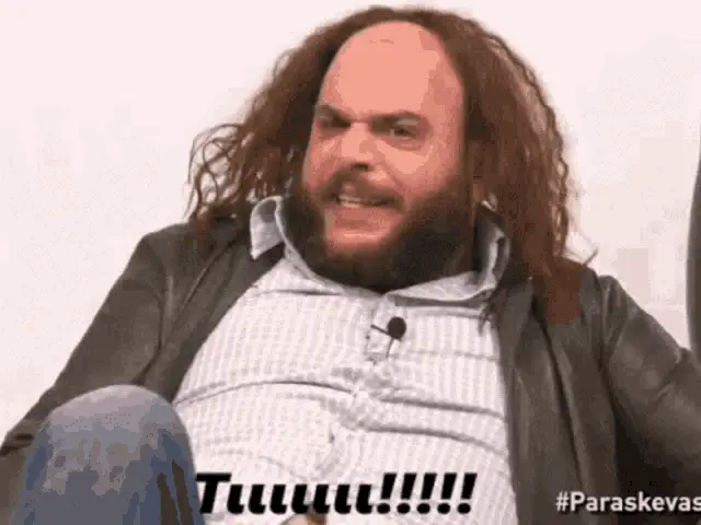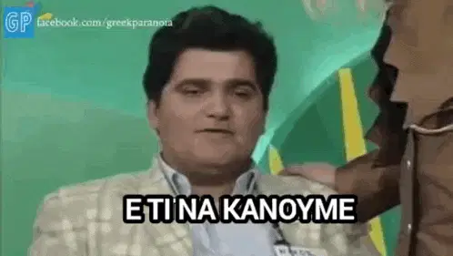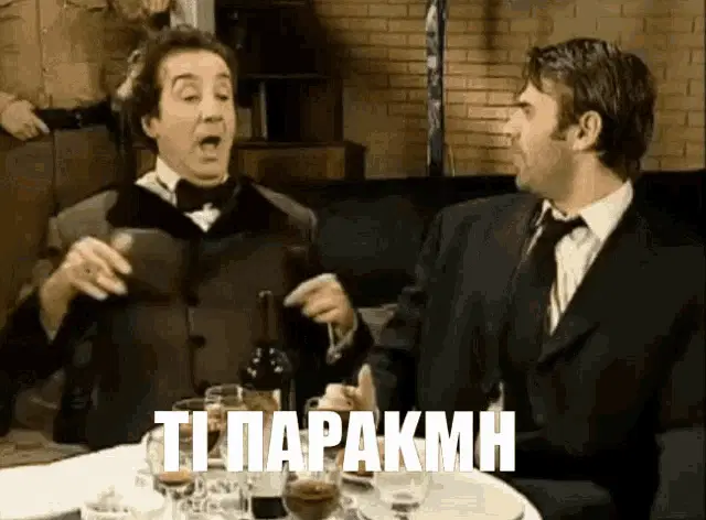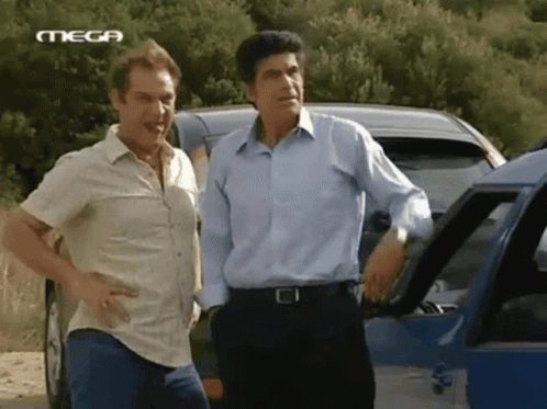 Makis Kotzabasis and another man react to women, from the Greek show 'Eftychismenoi Mazi'.