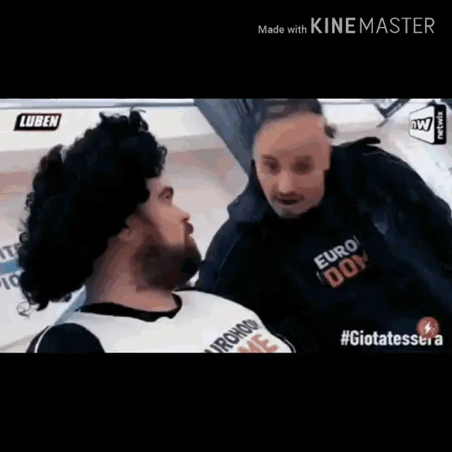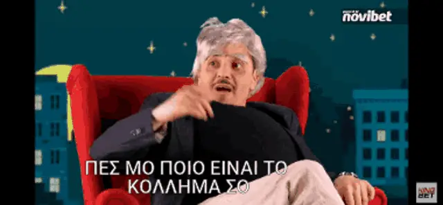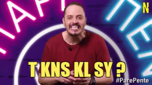 Comedian Tsouvelas enthusiastically asks 'T KNS KL SY?' (What are you doing, good sir?) in front of a neon sign.