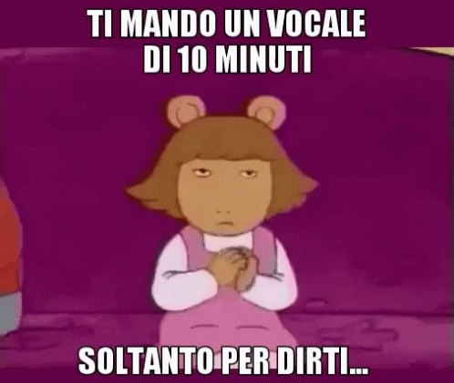 D.W. Arthur meme about sending a long voice note just to say something simple, with Italian text.