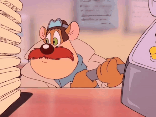 Dale from Chip 'n Dale, wearing a trench coat and hat, makes a funny face with a large mustache.