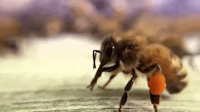 A cartoon bee with swirly eyes, wearing a bow tie, appears hypnotized and starts to fly. From Tic Et Tac Rangers Du Risque.