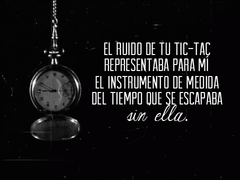 A black and white image of a pocket watch with a Spanish quote about time escaping.