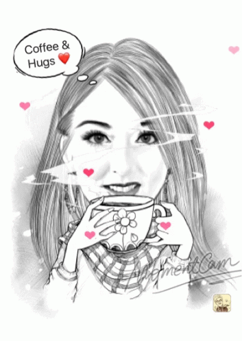 Black and white drawing of Tiffany Fox (Tfox610) holding coffee, with 'Coffee & Hugs' thought bubble.