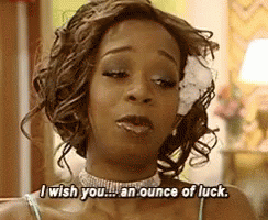 Tiffany, a woman with a flower in her hair, looks at the camera and says, 'I wish you an ounce of luck.'