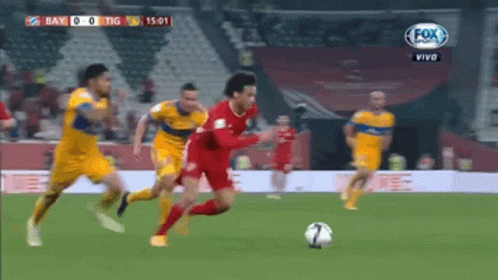 A player from Bayern Munich falls during a football match against Tigres UANL, broadcast live on Fox.