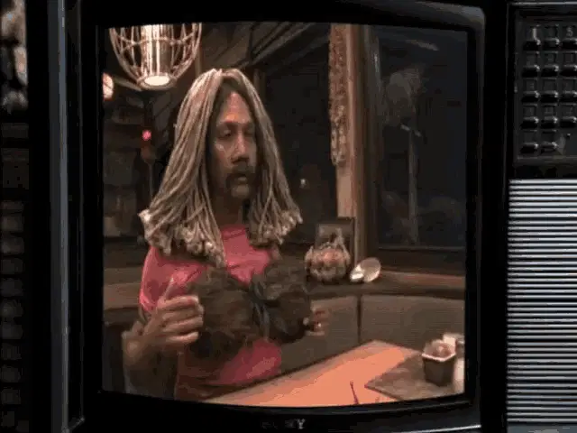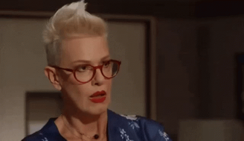 Tijana Dapcevic with short blonde hair, red lipstick, and red-framed glasses, wearing a blue patterned robe.
