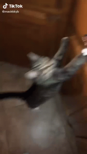 A curious cat attempts to open a kitchen cabinet, then quickly runs away after failing.
