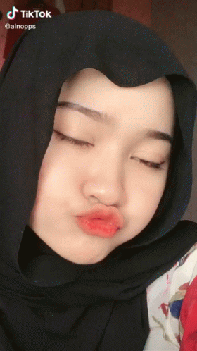 A young woman in a black hijab poses and makes cute, expressive faces for a TikTok video.
