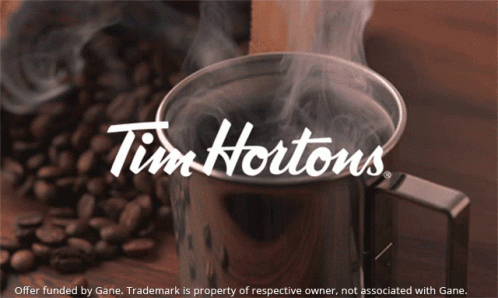 A steaming cup of Tim Hortons coffee with the iconic logo, surrounded by coffee beans.