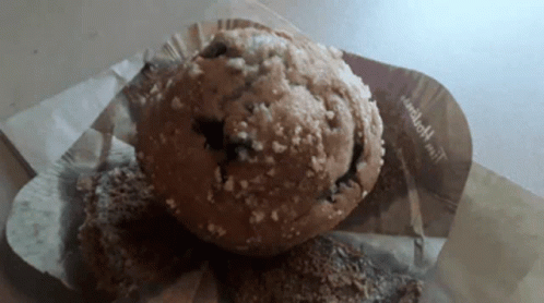 A close-up of a delicious Tim Hortons Wild Blueberry Muffin, resting on its branded paper.