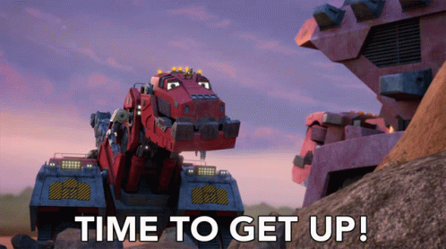 Ty Rux from Dinotrux with the caption 'TIME TO GET UP!', encouraging action.
