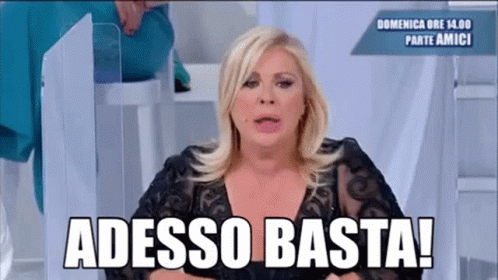 Tina Cipollari, a blonde woman in a black dress, emphatically declares "Adesso Basta!" (Enough now!).
