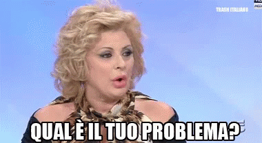 Tina Cipollari, with blonde hair and makeup, asks "Qual è il tuo problema?" directly to the camera.