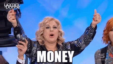 Tina Cipollari, wearing a sequined jacket, raises her arms and exclaims 'Money!' on the set of Uomini e Donne.