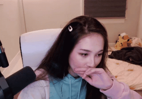 Streamer Tinakitten covers her mouth while thinking, wearing a hair clip and hoodie, with a Pikachu plushie nearby.