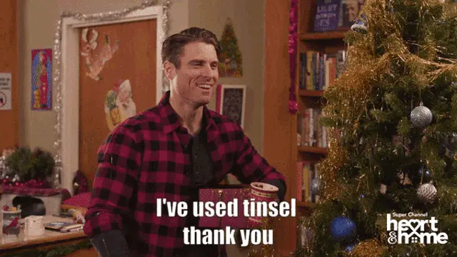 A sign displaying the words 'Tinsel' and 'Calm Down', possibly a humorous or decorative message.