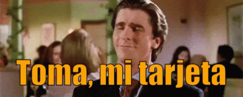Christian Bale as Patrick Bateman, with an arrogant smirk, presenting his business card.