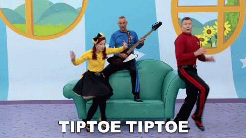 Emma Watkins, Anthony Field, and Simon Pryce from The Wiggles perform a fun tiptoe dance on a colorful set.