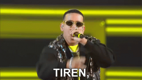 Daddy Yankee performing his hit song "Tiren Que Tiren Pa Lante" live on stage, wearing sunglasses and a sparkly jacket.