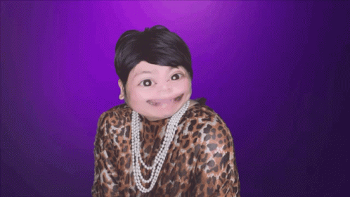 Titache Filipino makes a hilarious face, wearing a leopard print shirt and pearls.