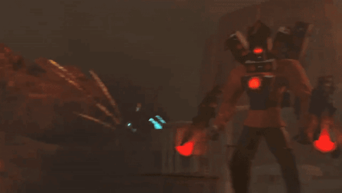 The powerful Titan Cameraman character from Skibidi Toilet, glowing with blue light in a dark environment.