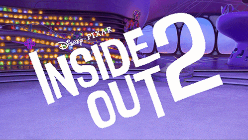 Joy and other emotions appear around the 'Inside Out 2' title card on a vibrant purple background.