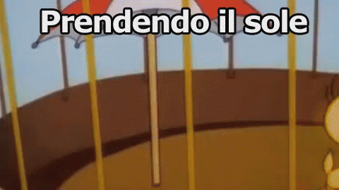 Tweety Bird (Titti) from Looney Tunes relaxing and sunbathing under an umbrella, wearing sunglasses.