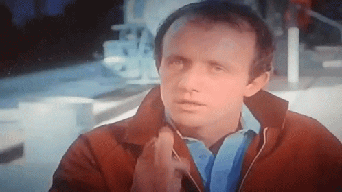 Tj Hooker, wearing a red jacket and blue shirt, points a finger gun with a smirk.