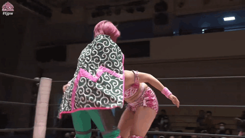a woman in a pink outfit is doing a handstand in a wrestling ring with the word omega on the mat