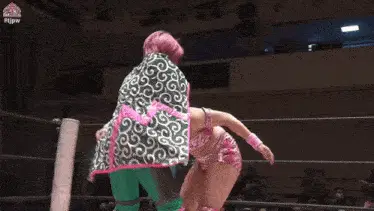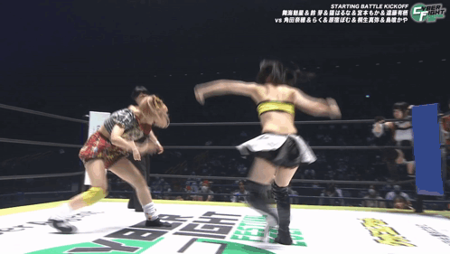 a woman is laying on the ground in a wrestling ring with the words starting battle kickoff on the bottom right